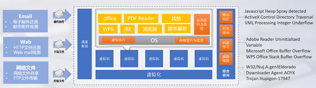 同时,本项检测技术还组合调度多沙盒组成的沙箱来监测分析来满足对高性能处理能力的需求。高阶文件沙箱具有虚拟化沙箱反逃逸技术。检测系统的虚拟化检测引擎可检测用户交互差异性、运行环境差异性、业务逻辑差异性三类共200+种逃逸手段,能够有效解决沙箱逃逸的对抗性问题。