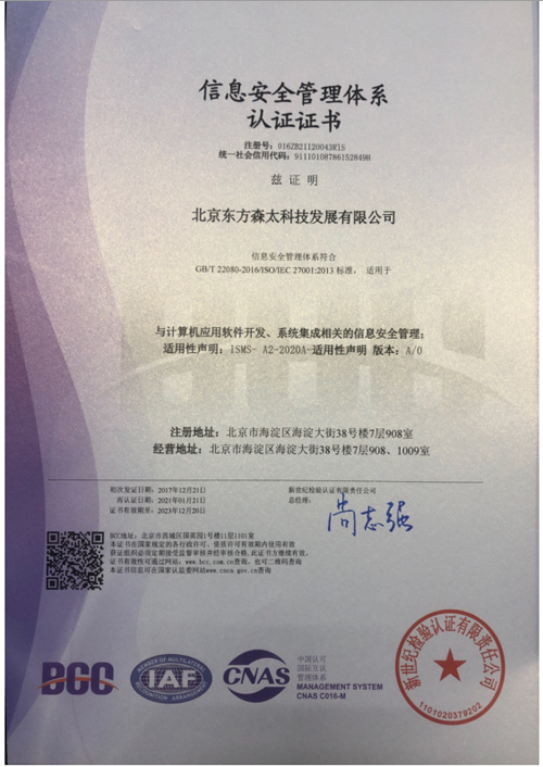 为了适应当前信息技术快速发展的需要,北京东方森太科技发展有限公司于近日申请了ISO27001,并成功的获得了认证。ISO27001是全球范围内受到广泛认可的信息安全标准,定义了11个信息安全控制域和133个控制项。该标准目前已经被很多世界级组织所采用,也已经成为全球性客户选择软件服务商的关键指标之一。ISO27001,成功认证为北京森太科技发展公司增加了一道防火墙,增强了竞争力,也意味着森太长期建立的信息安全体系达到国际标准水平,可以为企业提供更多信息安全领域的服务。