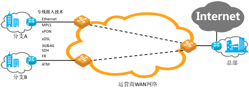 互联网容量持续增长,企业分支机构和总部通过互联网连接,逐渐可行,并且互联网租赁费用适宜。企业租用互联网链路(xPON、xDSL、以太网等)的成本,通常是MPLS连接成本的1/3 、1/2,并且,业务发放的周期短,租用灵活。企业在传统专线的基础上,通过Internet连接企业总部及分支机构(如图3所示)。这种场景通常称为Hybrid-WAN,要求能够基于网络的实时状态,将业务动态分发到总部和分支机构之间的多条路径上。最初的Hybrid-WAN解决方案,在分支机构部署复杂的CPE设备,通常是在路由器上集成各种网络增值服务,包括WAN优化、安全(防火墙、VPN)、x86硬件平台(可扩展新的网络增值服务)等。这种传统路由器的配置管理复杂,需要专业人员维护。