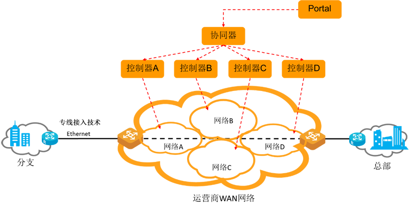 随着以太网技术的普及,运营商提供以太网服务,可以提供E-Line、E-Tree以及E-LAN服务,带宽的订购相对灵活。运营商目前引入SDN技术,在WAN网络中部署SDN控制器以及协同器,专线业务发放的效率也将显著提升(如图2所示)。专线的高可靠性,依托于运营商专网,或者,运营商为专线分配独占的网络资源,但专线的成本依然很高。