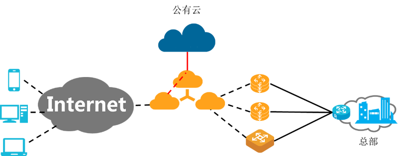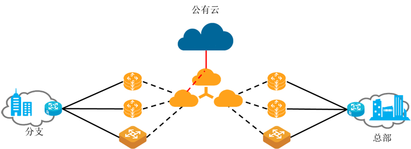 这种场景下,运营商可以建立一张专网,接入各种公有云资源。在企业分支/总部的CPE设备(或者运营商的边缘云节点),能够识别出公有云业务,并且将业务流发送到运营商最近的公有云接入/交换节点。