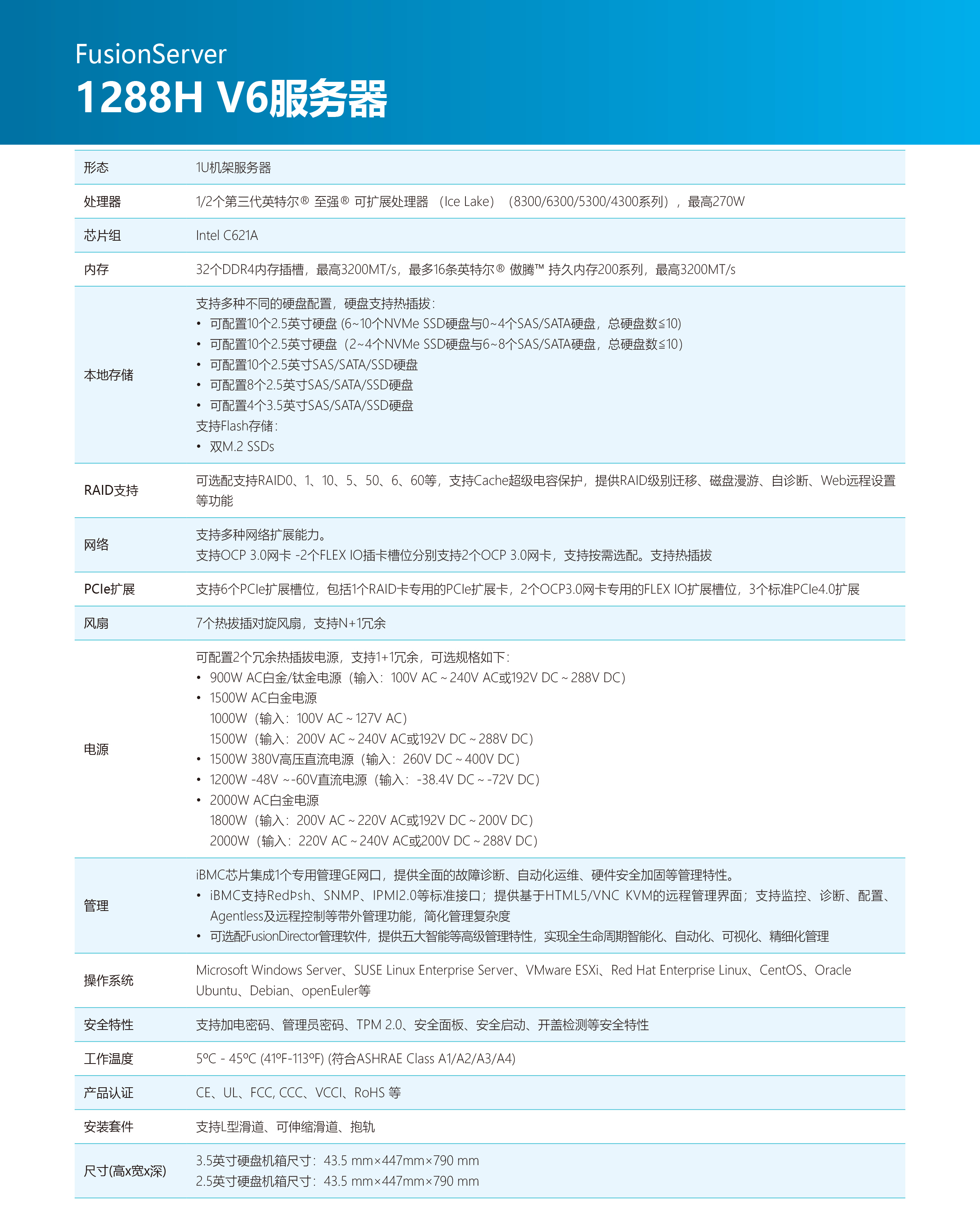 FusionServer 1288H V6是一款1U2路机架服务器,适用于云计算、虚拟化、高性能计算、大数据处理等负载的高密度部署,提升数据中心空间利用率。1288H V6在1U空间里可配置2路英特尔®至强®可扩展处理器、32条DDR4内存及4个3.5英寸或10个2.5英寸的本地存储资源(可配置4/10个NVMe SSD硬盘)。集成DEMT智能功耗管理、FDM智能故障管理等专利技术,可选配FusionDirector全生命周期管理软件,能够有效降低运营成本、提升投资回报。