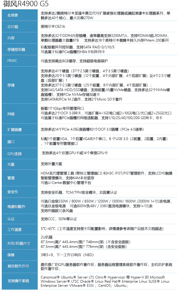 全新一代YuFeng R4900 G5通过多达32个NVMe SSD1的支持,以及M.2 SSD形 态的引入,进一步增强了面向现代数据中心的扩展能力和配置灵活性。