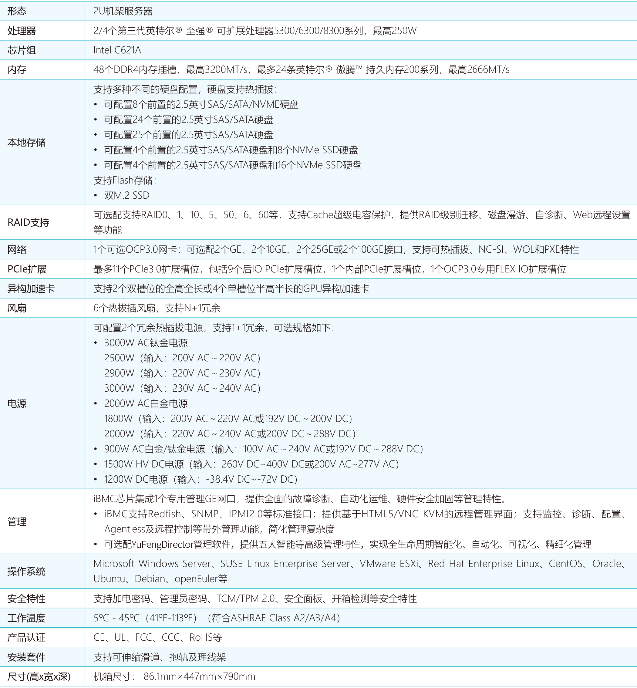 YuFeng 2488H V6是最新推出的2U4路机架服务器,适用于云计算、虚拟化、高性能计算(HPC)、数据库、SAP HANA等计算密集型场景。相比于2台2U2路机架服务器,在虚拟化应用场景中2488H V6可以带来更多的OPEX节省。2488H V6在2U空间内可配置4个第三代英特尔® 至强® 可扩展处理器,48条DDR4内存,11个PCIe扩展插槽以及最多25个2.5"的本地存储资源。集成DEMT智能功耗管理、FDM智能故障管理等专利技术,可选配YuFengDirector全生命周期管理软件,能够有效降低运营成本、提升投资回报。
