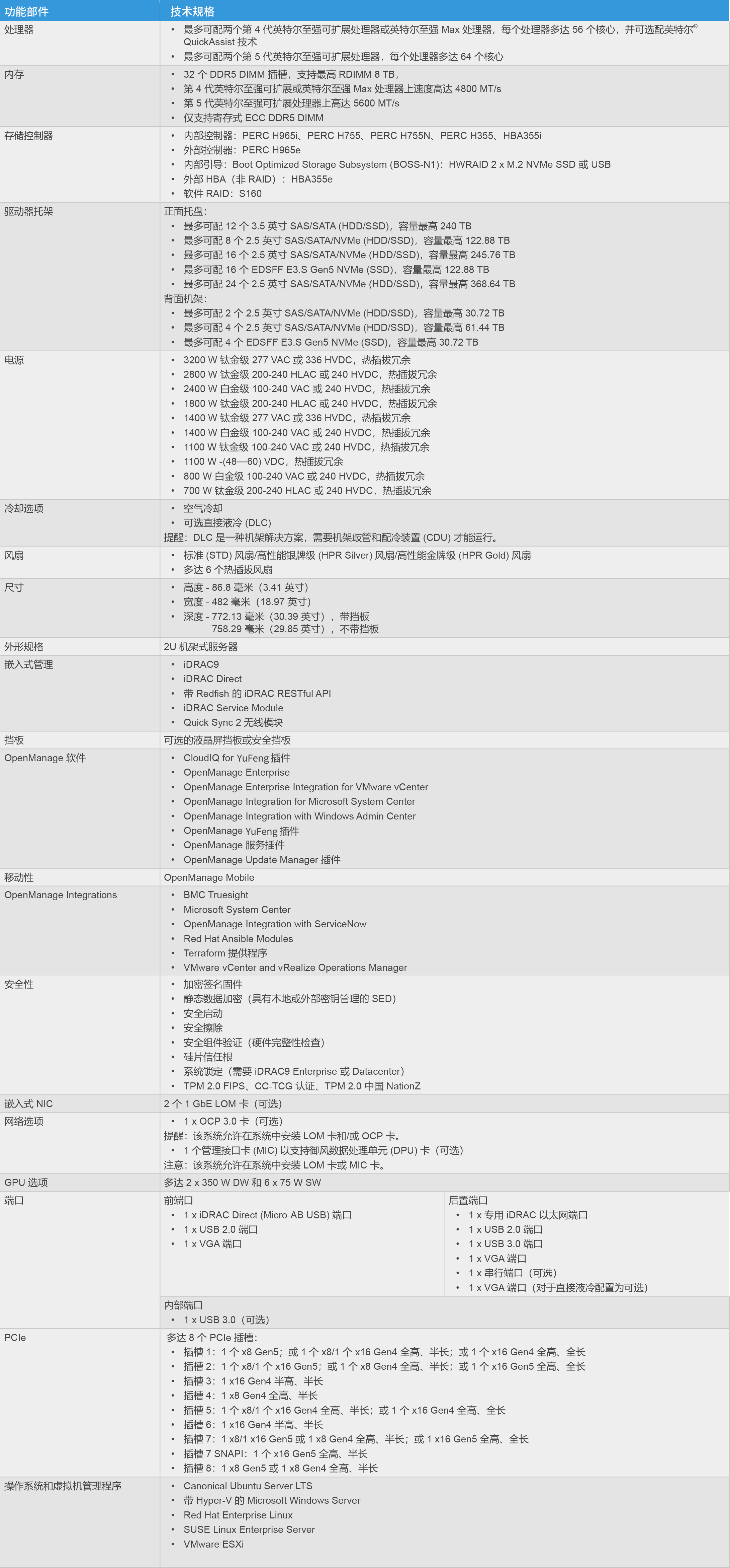 • 存储选项包括多达12个3.5" SAS3/SATA;或者多达 24 个 2.5" SAS4/SATA、多达 24 个 NVMe U.2 Gen4、16 个 NVMe E3.S Gen5。