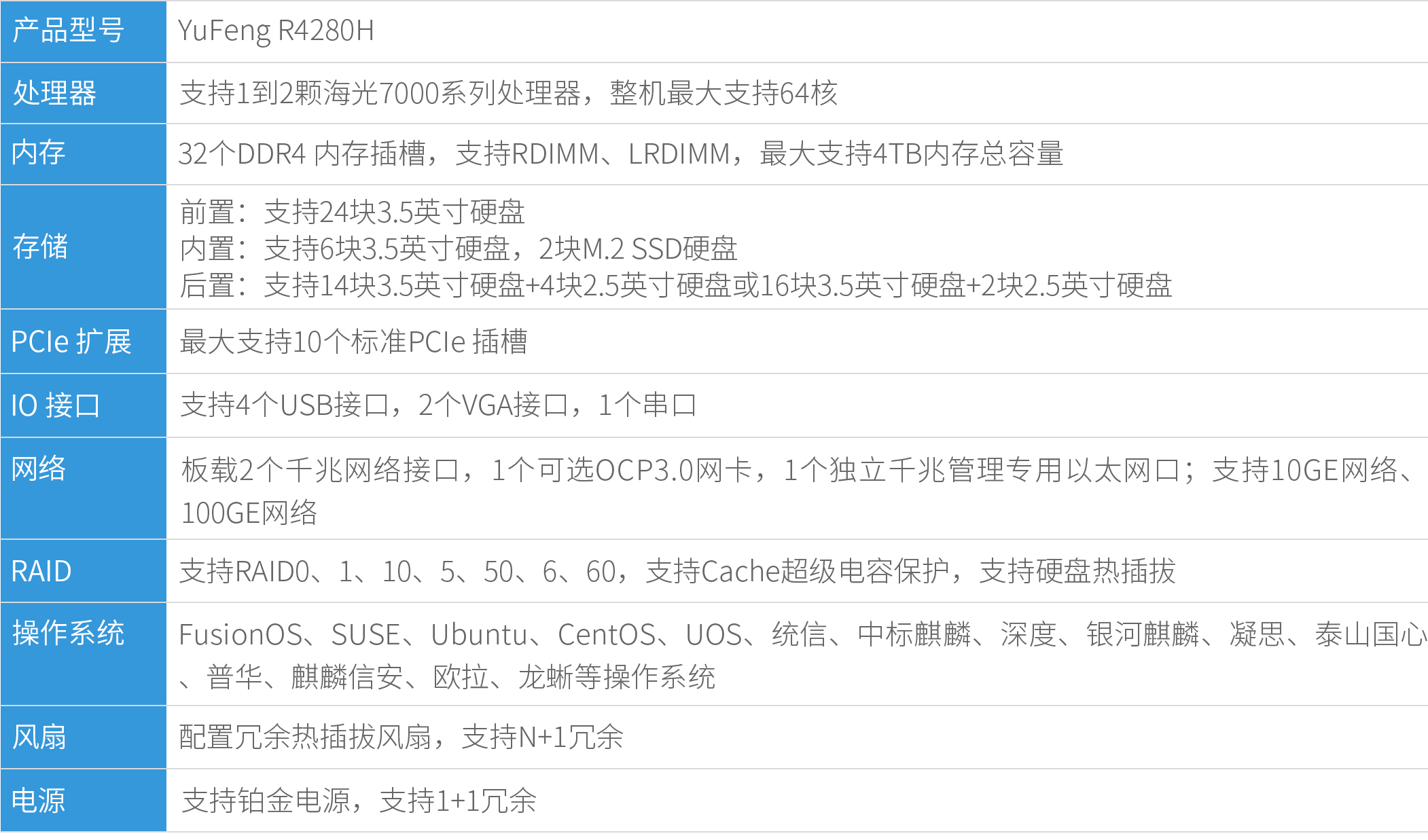 YuFeng R4280H 是基于最新海光7000处理器的4U机架式存储型服务器,提供高性能、安全可靠的存储平台,支持多种阵列选择,配置智能管理系统,轻松实现远程的数据管理和保护,适用于温冷数据存储、视频监控存储、大数据存储、云存储、备份归档等应用场景。