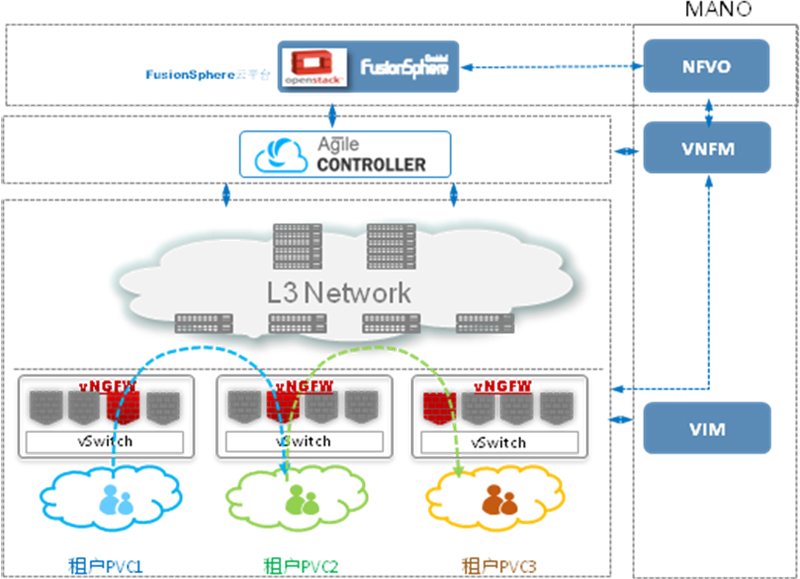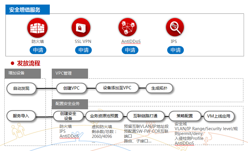 - 租户通过FusionSphere云平台的Portal订阅安全增值服务, MANO部署USG6000V, Agile Controller完成网络预配置及基于应用的4~7层安全策略下发,整个业务上线过程全部自动化。