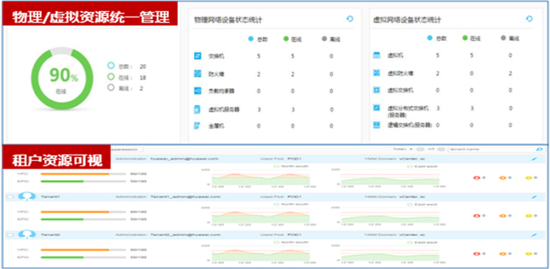 - 运维可视化:提供全网虚拟资源到物理资源的拓扑互视,实现网络故障的快速定位。提供基于租户的网络虚拟化管理视图,实现租户的网络拓扑、配额、流量、告警可视,满足合规要求。