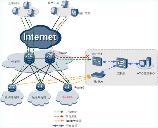 数据中心(Internet Data Center,简称IDC)是网络基础资源的一部分,为互联网内容提供商、企业、媒体和各类网站提供大规模、高质量、安全可靠的数据传输服务和高速接入服务。数据中心主要提供DNS服务器、Web服务器、游戏等业务。近年来,来自外部互联网针对数据中心的DDoS攻击越来越多,包括重要用户服务器遭受攻击,数据中心链路带宽被占用,以及视频、游戏、网游等业务遭受的应用层攻击。