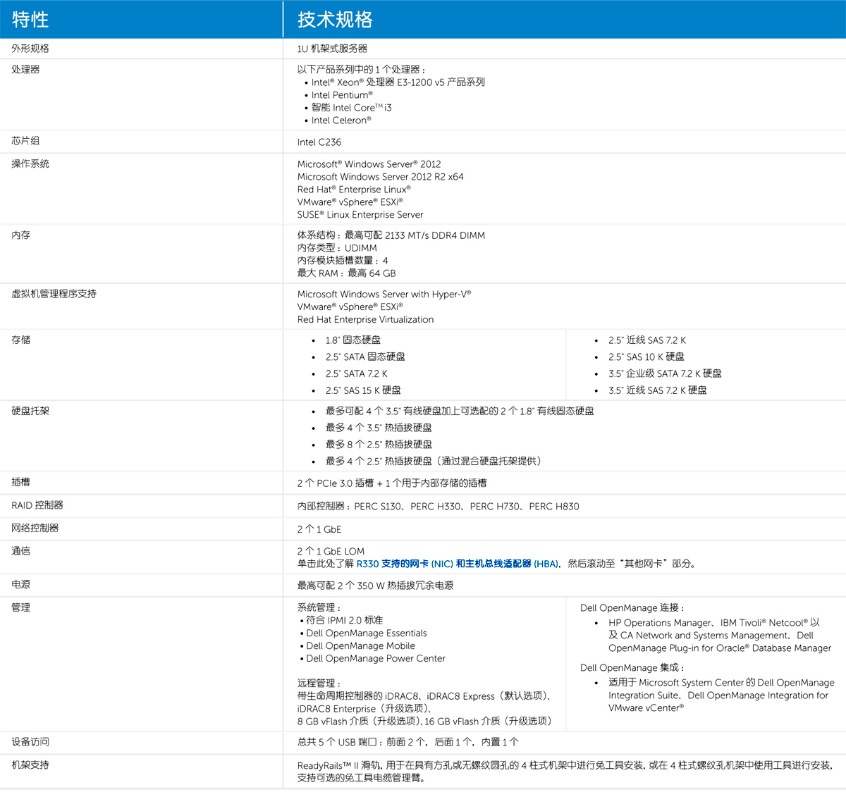 Dell PowerEdge R330 非常适合作为 SMB 的优选服务器或替换服务 器,对大型机构来说也不失为一款经济实惠的 ROBO 服务器,非常 具有吸引力。与前一代 PowerEdge R320 相比,R330 支持 DDR4 内存(与 DDR3 相对)、PERC9(与 PERC8 相对)、集成戴尔远程 访问控制器 8 (iDRAC8)(与 iDRAC7 相对)以及 Intel® Xeon® E3 处 理器(与前一代服务器中的 Intel Xeon E5 处理器相对)。